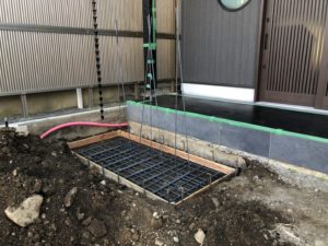 次に鉄筋を型枠の中に組み立て作業。前もって倉庫で鉄筋作業は仕上がっていたので設置のみ。